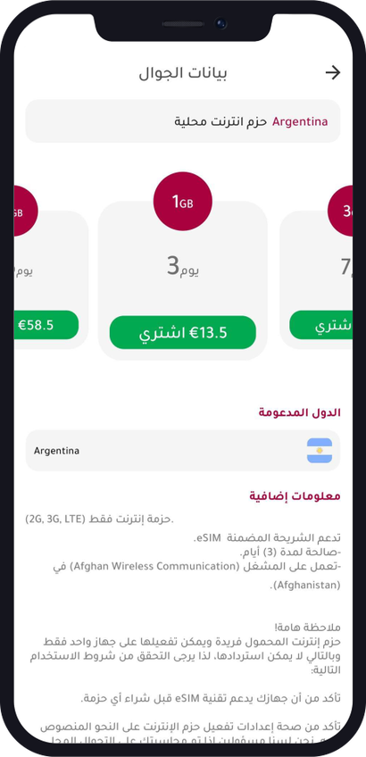 - سهولة التفعيل: يمكن تفعيل خطط انترنت الهاتف بسهولة عند الوصول إلى الأرجنتين، مما يلغي الحاجة إلى بطاقات SIM الفعلية وعمليات التسجيل الطويلة.