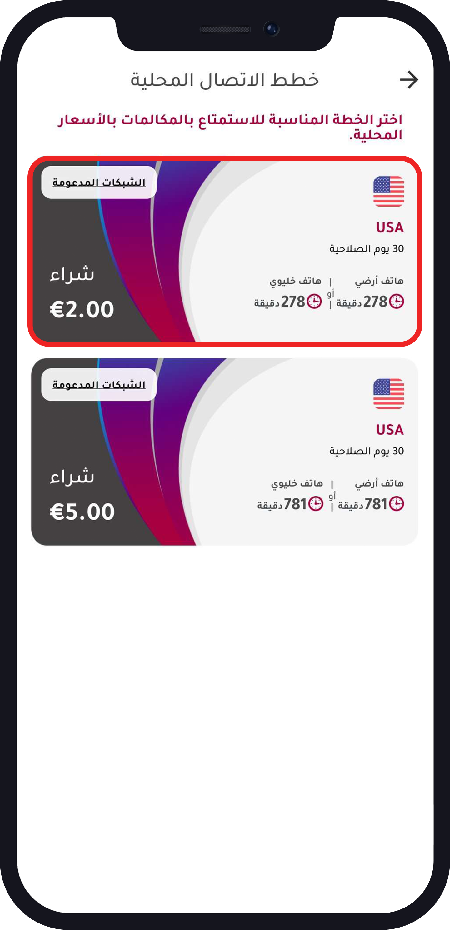 اختر الخطة التي تناسبك > اضغط على “الشبكات المدعومة” لمعرفة الشبكات التي يمكنك الاتصال بها بسعر محلي وأكمل عملية الشراء.