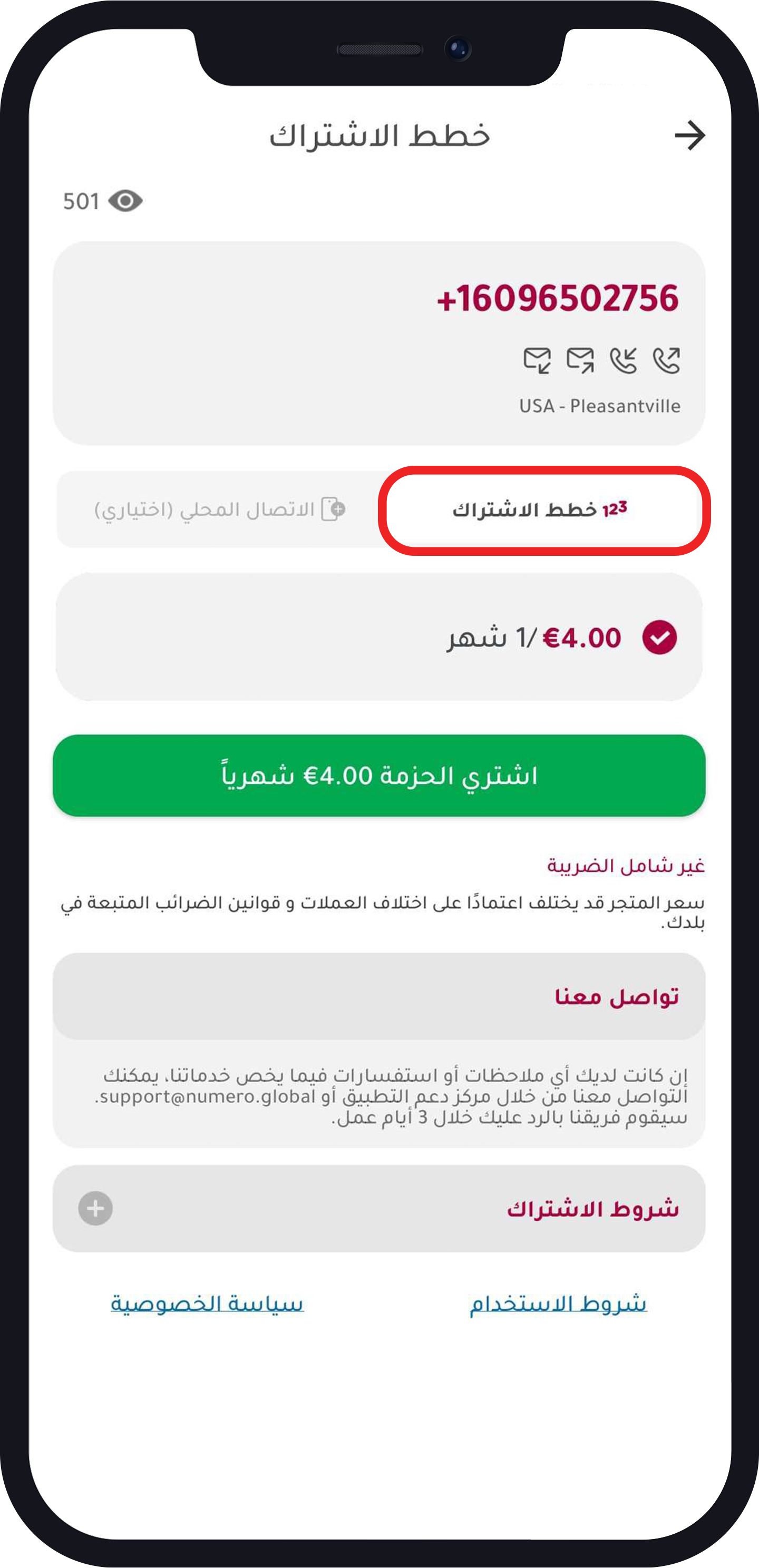 ستتمكن من رؤية خطط الدقائق المحلية المتاحة عندما تريد شراء الرقم.
