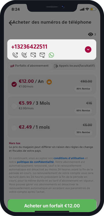 Pour les numéros de réseaux sociaux, choisissez le numéro dans la liste déroulante > choisissez le plan approprié > et finalisez l’achat