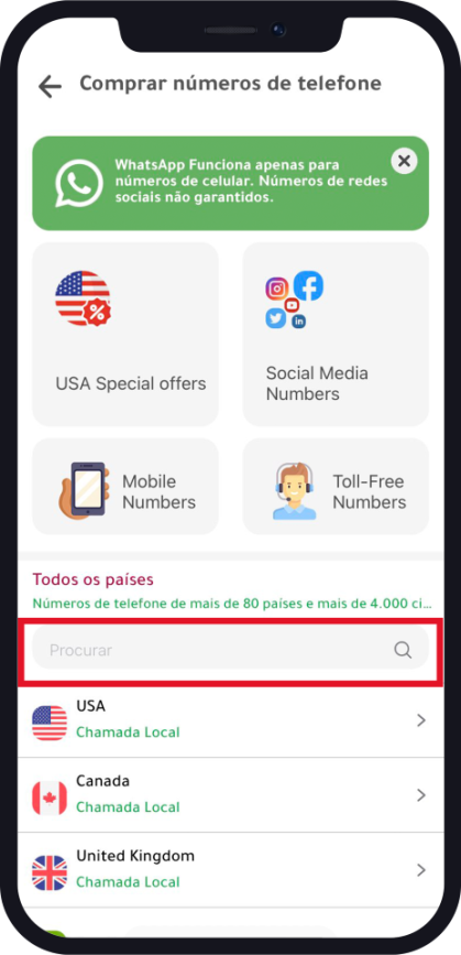 Se você quiser comprar um número brasileiro local, siga estas etapas: