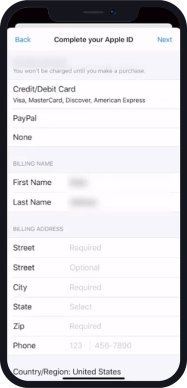 18. Make sure that the country is the US. Agree on the terms and conditions, and tap “Next”